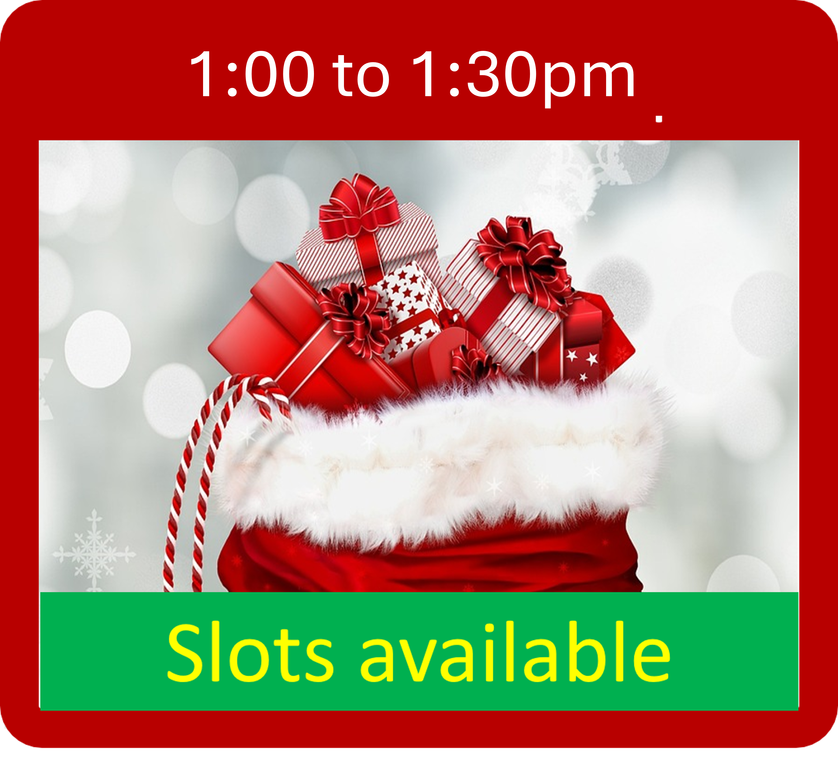Santa will be with us from 12:00 until 1:30pm. If you have any specific timing requests, please add these to the comments box on the booking form and we will do our best to accommodate your needs.